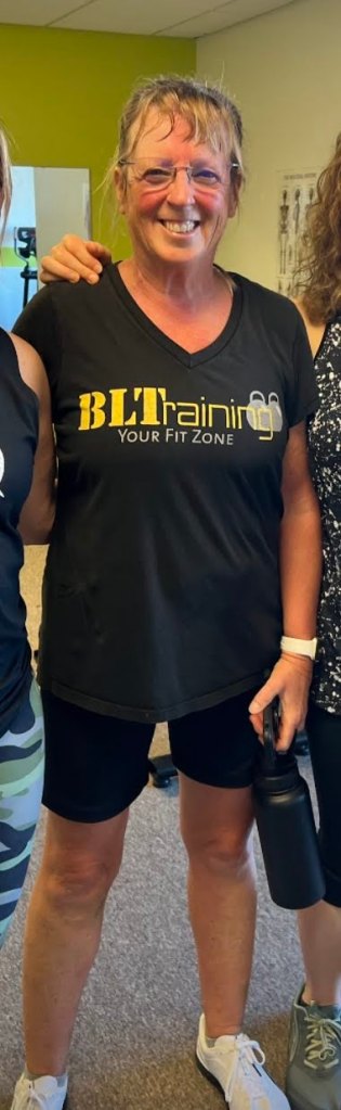 Andrea: When Brenda rebranded to BLTraining and moved, I decided to follow her due to the way she instructed her classes. I do remember trying aerobics and found I had a hard time getting through 20 minutes. I also remember hating to sweat. While I was starting to lose weight (perhaps 10-15 pounds at this point), there was a time I didn’t feel weight was coming off fast enough and almost decided to quit going. But Brenda kept changing and learning and she started sharing her knowledge not only about exercise but also about muscle groups and nutrition. We started more focused strength training, learned about small muscles, did cardio, discussed nutrition, etc. These little tidbits were making sense to me even though I didn’t always follow what she was sharing. Believe it or not, I really didn’t get serious about the fitness portion until 2017 when I retired! By this time, Brenda was moving into personal training and really focusing on flexibility and movement. I signed up for a personal session. I was not flexible at all! She pointed out several areas for improvement but started small. She gave me several exercises to do during the week before we met again. I met with her one on one for a month or two. She then started an IMPEL class which had five members in it. These were the same five women who followed her like I did. As we moved into talking about nutrition and sharing our failures and successes, they were a great support group. If I didn’t show up for a class, there was often a text asking where I was. At one point they asked if I was home eating potato chips. I replied that I was not. I was eating pretzels! While funny, it also goes to show how we were holding each other accountable. Brenda had even had us setting goals and was starting to weigh and measure us as we moved through our journeys together.
